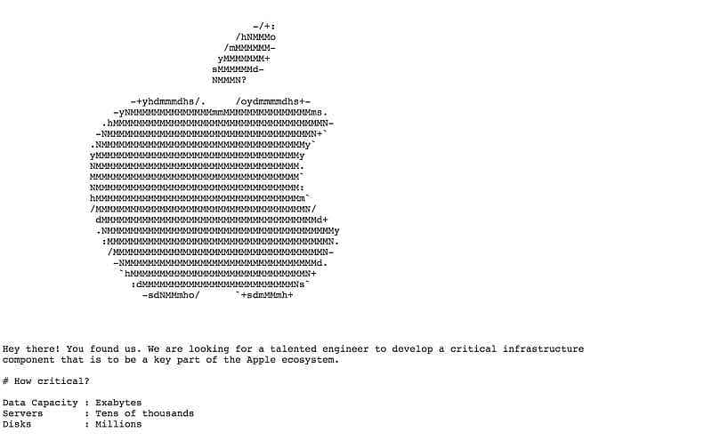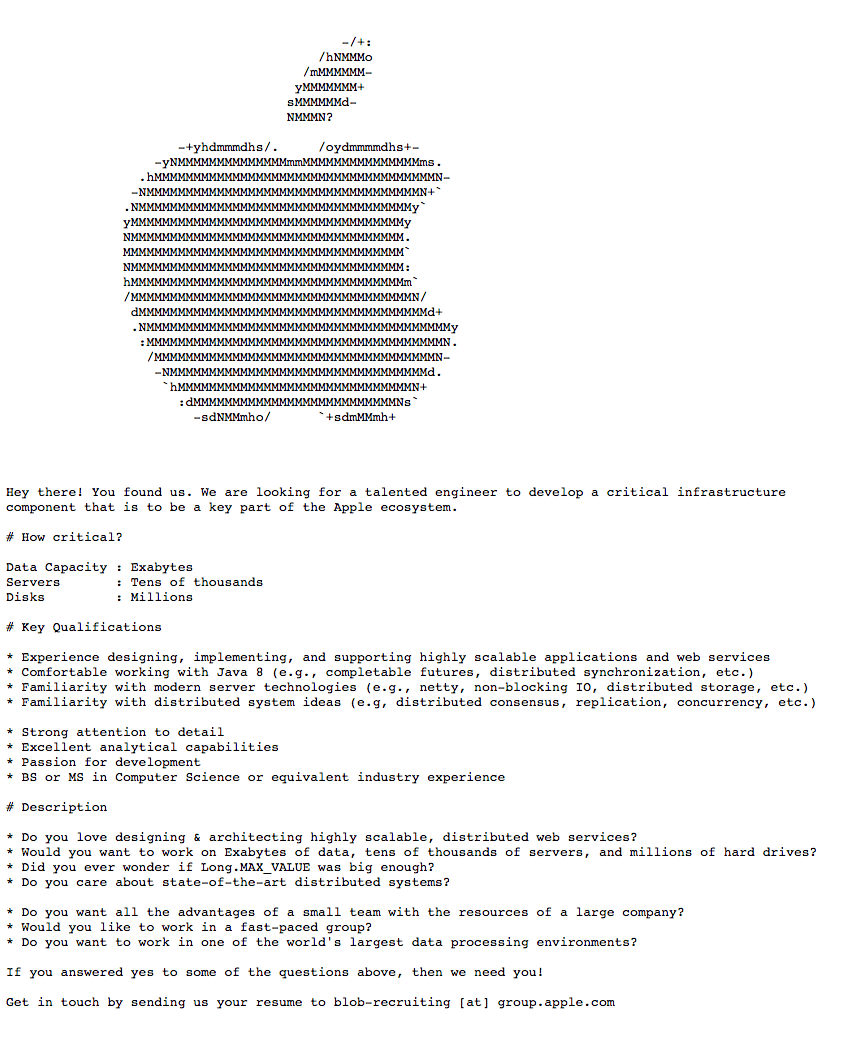 苹果公司通常会在招聘页面上列出招聘信息,该公司约有10万名员工。然而,这些工作的竞争仍然非常激烈。这个特殊的职位列表要求招聘一名员工,该员工将构建基础设施,以处理数百万个驱动器和数千台服务器中的eb级数据。