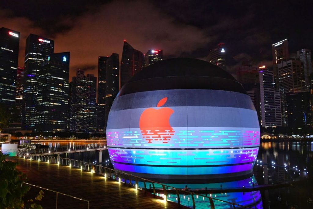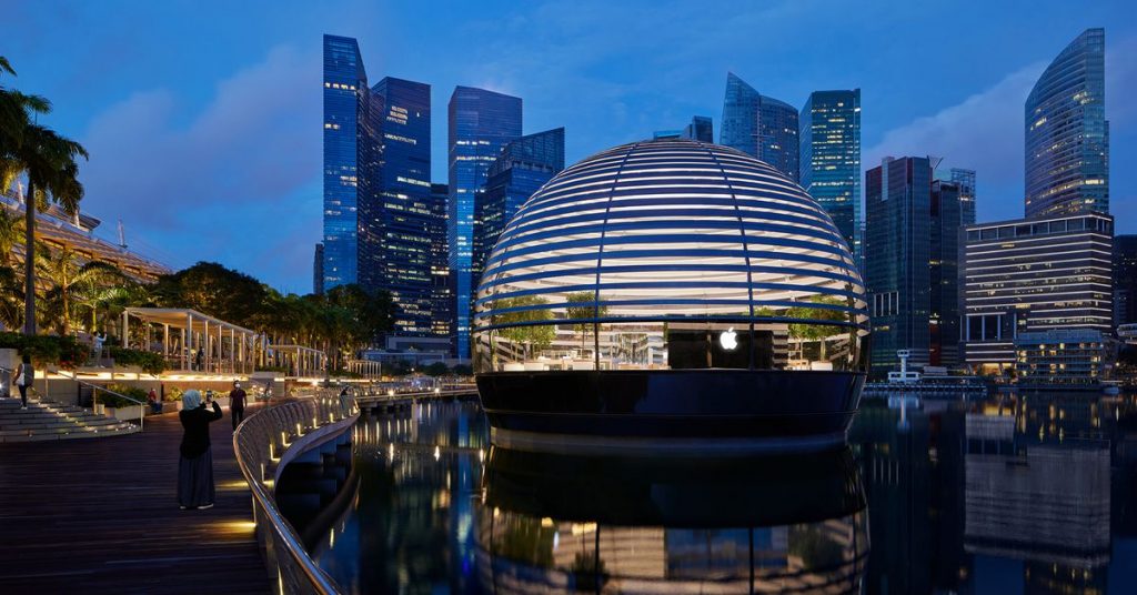 苹果说:“苹果滨海湾沙沙(Apple Marina Bay Sands)完全被所有侧面的水响起,可欣赏大都市及其宏伟的天际线的360度全景。”