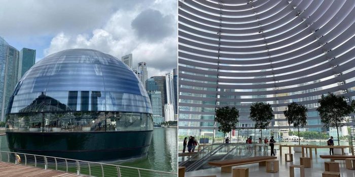 Apple Marina Bay Sands恰好漂浮在新加坡的水上,并被称为Apple有抱负的零售项目,最近已完成。水下通道进入它,由于其玻璃外观,该建筑本身提供了壮丽的全景。