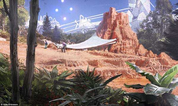下面的插图也是来自这样一个人,他想知道人类的殖民地会是什么样子。你准备好通过他的眼睛来观察未来的火星了吗?来认识一下维尔·埃里克森,他是一位来自瑞典斯德哥尔摩的26岁插画家和概念艺术家。他的效果图展示了被玻璃包裹的城市,登山者试图克服巨大的火星火山、奥林匹斯山和空间站轨道。这也表明,未来的火星已经经历了地球化。城市里可以看到交通圆顶,地上可以看到植物和草。