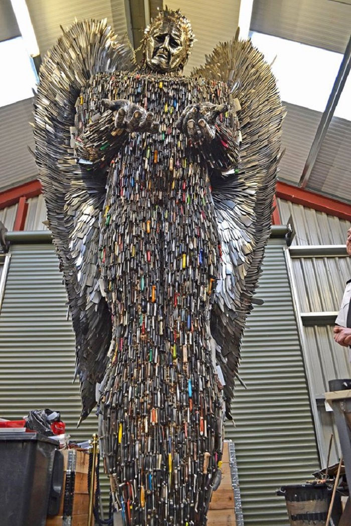 枪支在英国并不常见,但是刀具犯罪变得非常频繁,并且要提高人们对日益增长的问题的认识,艺术家阿尔菲·布拉德利(Alfie Bradley)花了多年的时间,建造了24英尺长的雕塑,其中100,000刀的天使。