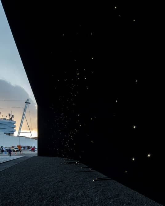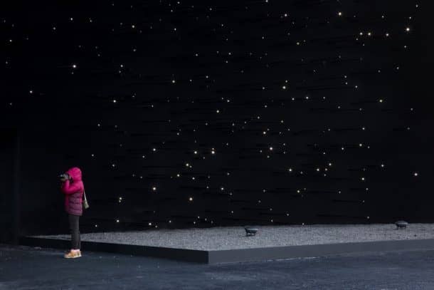 Vantablack喷漆的首次艺术用途是由Asif Khan完成的。令人兴奋的是,如何将3D结构完全覆盖到油漆中可以将其变成一个完全平坦的物体。为了进一步增强幻觉,可汗在弯曲的表面上种植了许多LED灯,并产生了一种星场效应。