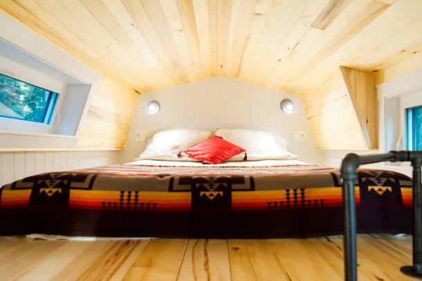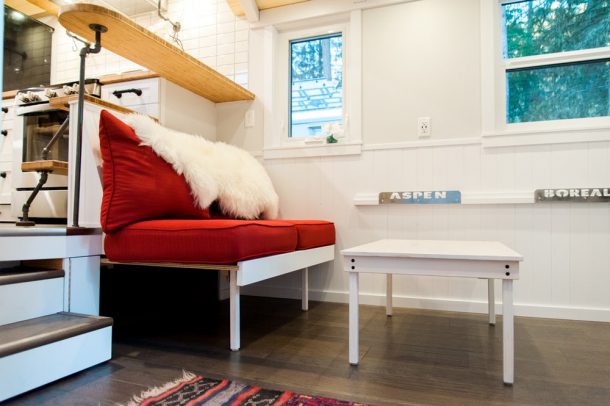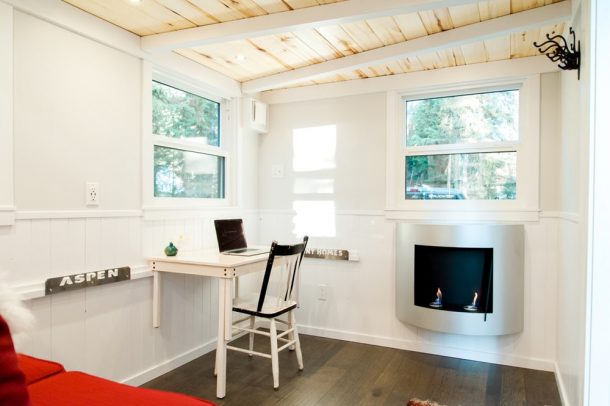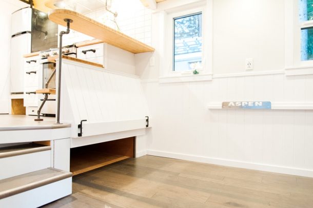 Aspen长24英尺,地板空间为268平方英尺。它基于双轴拖车,并使用结构绝缘面板(SIPS)构建。它具有金属屋顶,雪松壁板和辐射地板加热。小房子的内部在当地磨坊和雪松以及工程硬木地板和竹台面上完成。