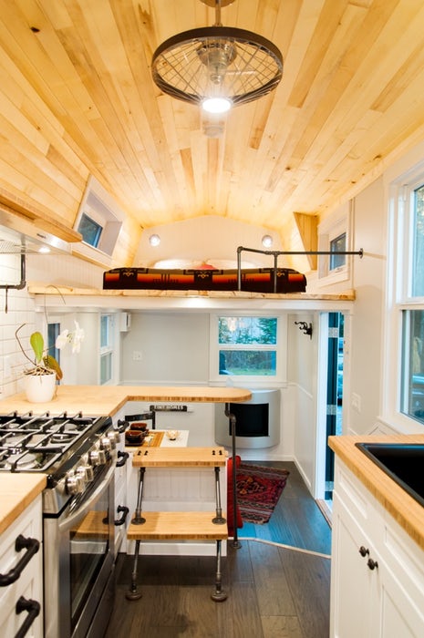 北方小屋(Borealis Tiny Homes)专注于储存空间,同时设计了这个小房子,并添加了一个拉出的步骤区域,每个步骤都充当抽屉。厨房地板下有爬网空间,这是一个小房子,一个小的储物阁楼的必要条件。