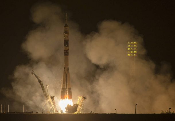 我们的视觉旅行始于俄罗斯火箭登机的宇航员。
