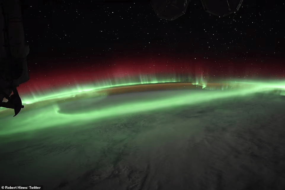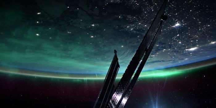 看到更迷人,当从数百英里的地球表面以上,NASA宇航员杰克Cassada最近捕捉到辉煌的新形象来自国际空间站,晚上显示地球的曲率和greenish-turquoise阴霾覆盖。