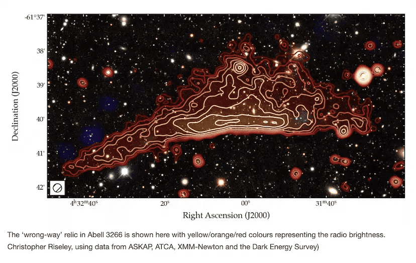 就Abell 326 Galaxy群集的组成而言,它具有独特的作品,引起了研究人员的注意。它结合了声音繁荣的无线电波,“由冲击波[通过等离子体传播的电源提供动力》,如对话报道。在这一数字上,Vernstorm说:“如果这是一波冲击波,您可能会认为它会像边缘周围的弧线一样弯曲,但这是弯曲的。”