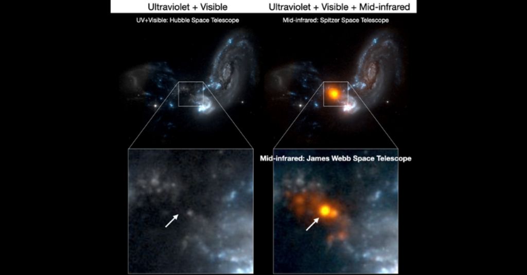 但通过用韦伯望远镜分析这些合并星系在中红外波长的发射,科学家们可以确定碰撞背后的“引擎”“比其他任何东西都亮”。
