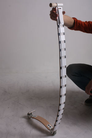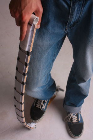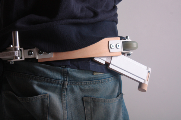 皮带踏板车是用户作为皮带佩戴的,是一辆摩托车。尽管它确实提出了一个问题,即那条皮带握住裤子的状况如何。它由一块弯曲的木头组成,足够强大,可以承受一个人的体重,但足够轻到腰间穿着。将垂直车把分为段,这意味着它们将保持柔韧性,直到拧紧内部的皮带为止。当它收紧时,整个设备将变得僵化。