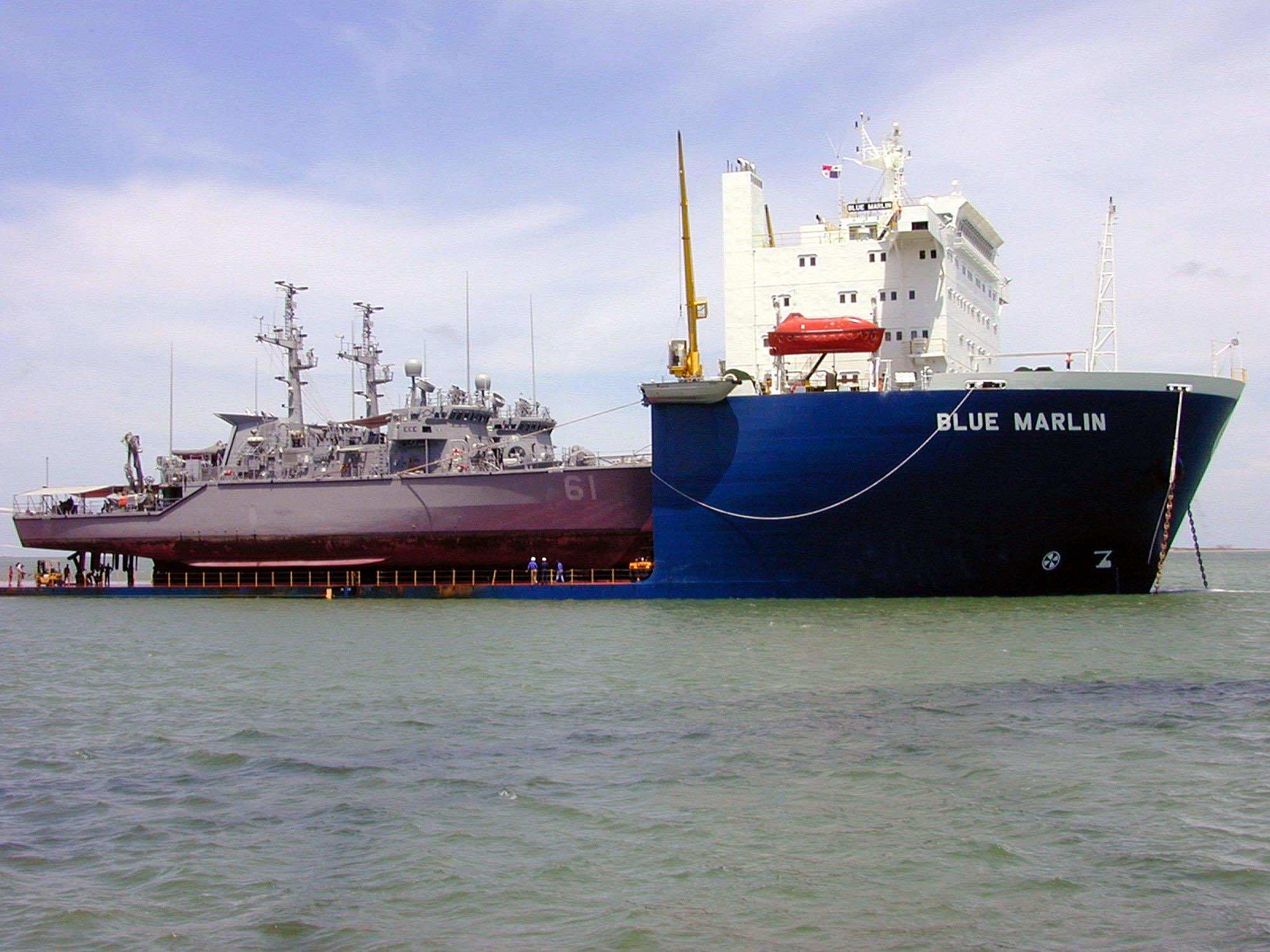 MV Blue Marlin能够运输船只,已经运输了一个巨大的石油钻井平台,甚至龙门吊也已经使用这艘船运输。你现在看到的是一艘217米长的半潜式重型起重船,载重量为56000公吨。发动机的输出功率为12640千瓦,这是很容易理解的,当你看到这个东西的巨大尺寸和它所承载的东西。