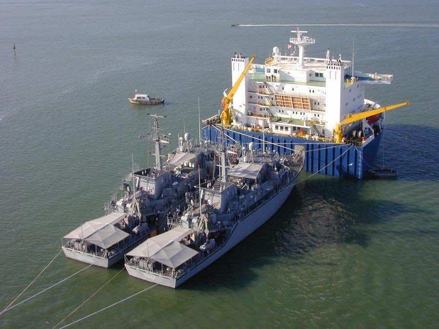 半潜式船通常被称为flo/flo,是浮上/浮下的缩写;它们配备了又长又低的甲板,一旦船在水下,漂浮的船只和钻机就可以被打捞上来。随后,船将货物吊离海面,准备运输。