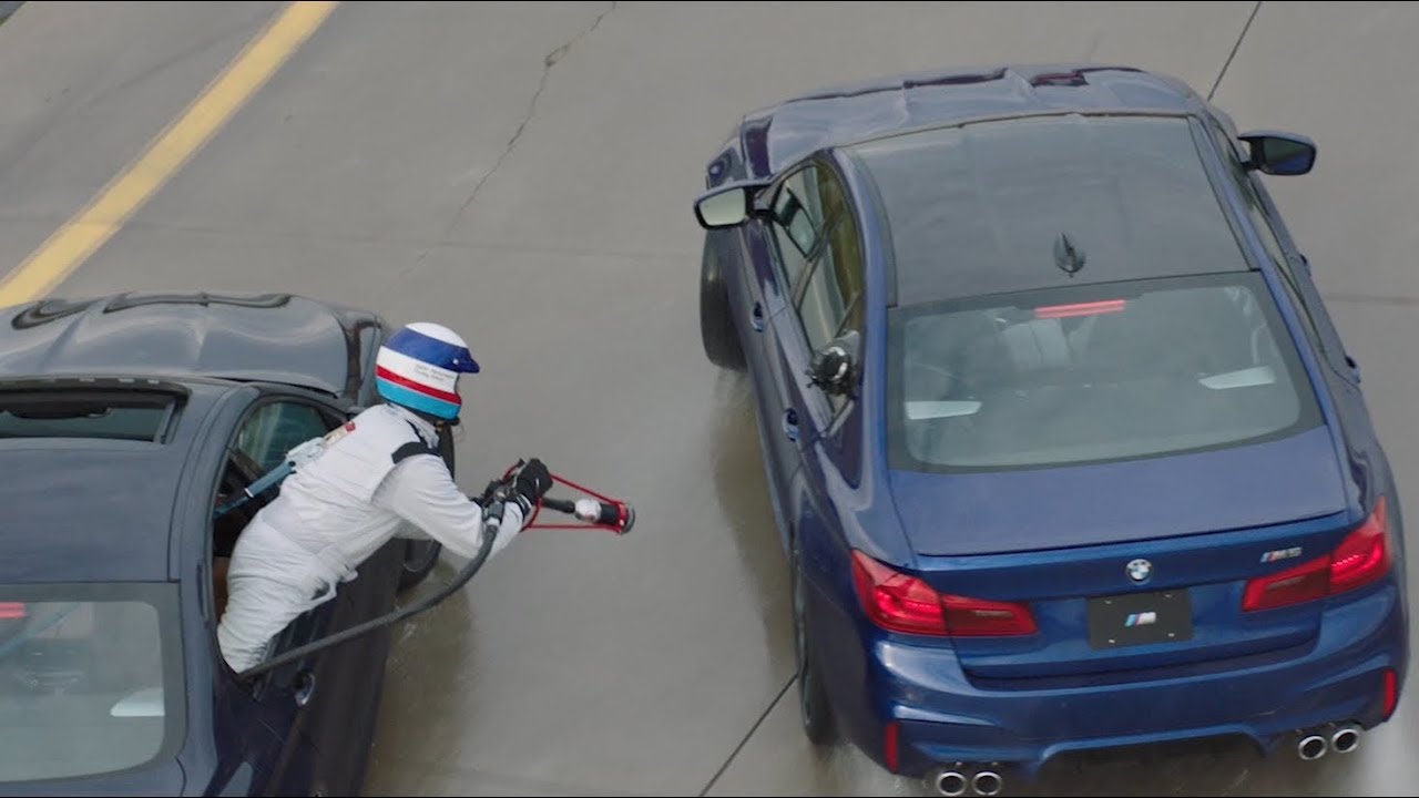 根据宝马的说法,燃料停止是为弱者和安装一个更大的油箱是无聊的,所以任务要求串联漂移。该团队对汽车做了轻微的改变,删除了上一代M5的后排座椅。这为辅助油箱和高压泵电缆腾出了空间。泵电缆可以在大约50秒内在两辆车之间输送多达18加仑的燃料。