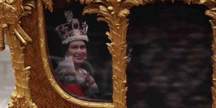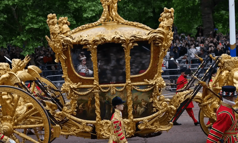 在白金禧年庆祝活动的明星时刻之一,教练在骑兵的陪同下陪同,展示了女王je下的老式镜头,使她感觉好像在里面。