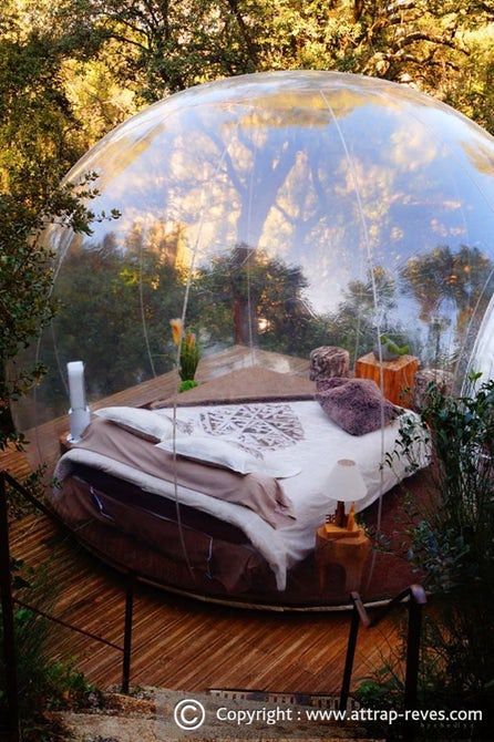 气泡房基本上是一个充气的圆顶,靠无声的通风系统保持直立。该系统保持空气清新,也使居住在室内的人保持完美的温度,无论外面的条件如何。呆在泡泡里的好处是非常明显的,尤其是当你在世界上任何一个美丽的地方露营的时候。