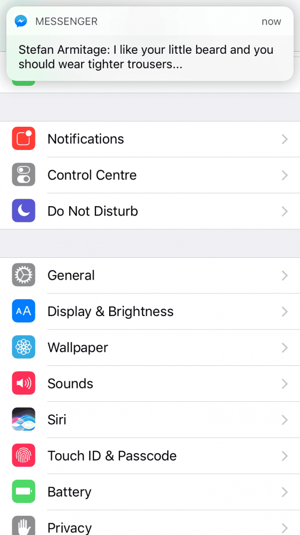 好消息是,有一种方法可以在Facebook Messenger上阅读一条消息而不离开收据。在通知横幅上读取消息是一种非常简单且众所周知的方法。在您的iOS设置中,转到通知并将通知设置设置为“横幅”或“警报”。哦!带给您的无可估量的和平。
