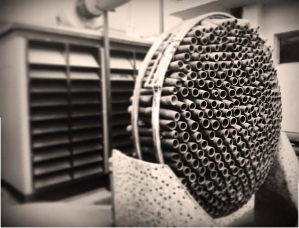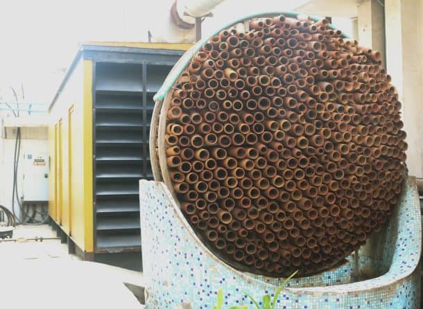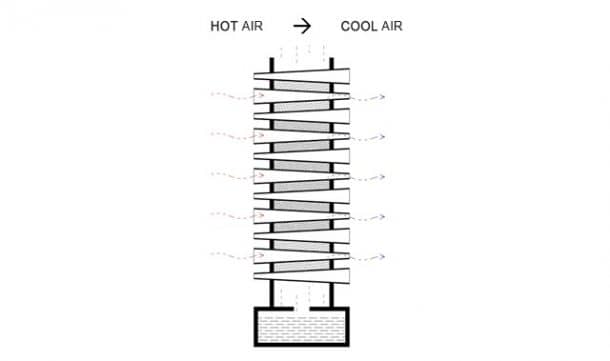 从工厂回收的室温水以喷泉流的形式被倒回建筑中,因此水沿着柱体流下,冷却通过的热空气。这套系统全天工作,一天只需要给球果打两次水。该系统已被发现以每秒4米的气流将50摄氏度(122华氏度)的热空气冷却至36摄氏度(96华氏度)。