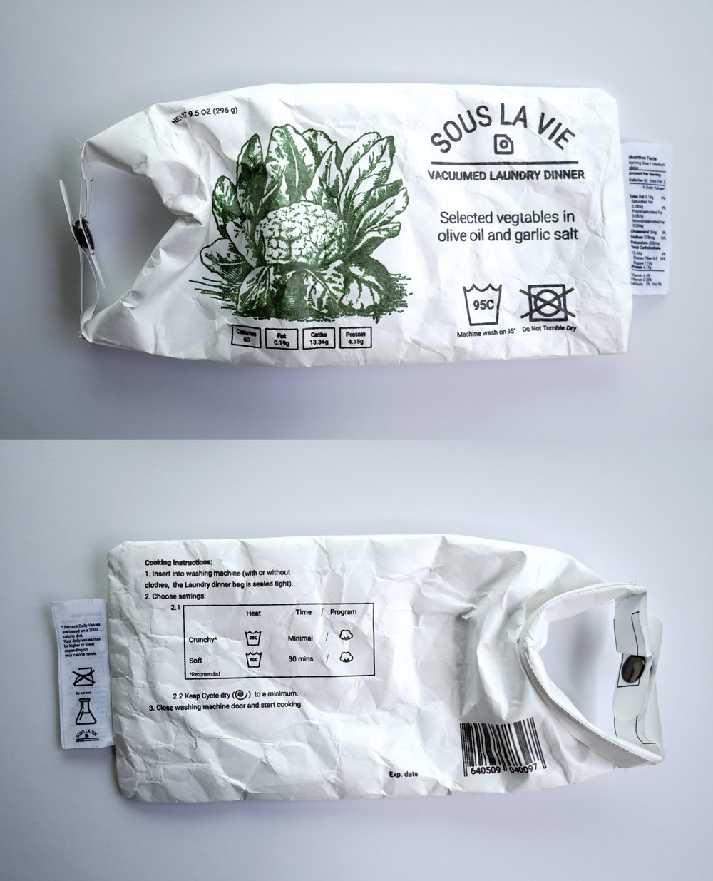 加齐特的灵感来自真空烹饪技术,真空密封的袋子在控制条件下在水浴或蒸笼中烹饪。他发明了蒸汽袋餐,你可以直接扔进你的洗衣房,无论是预先包装的食品,或香草牛排,或新鲜的鲑鱼。特卫克包是防水的,并附有服装标签。