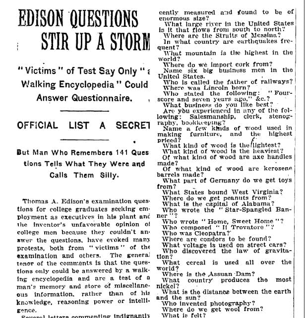 托马斯·爱迪生更喜欢雇佣那些能记住大量信息的人。在对那些精神上不适合工作的大学毕业生感到沮丧之后,他设计了一种就业测试来评估候选人的智力水平。根据爱迪生的说法,这样做的目的是为了雇佣具有出色记忆力的人,他们可以做出更好的商业决策。测试结果被泄露并发表在《纽约时报》上,连同答案一起,爱迪生多次更改问题。这些测试是有争议的,很多人不相信它们对测试知识或技能有任何好处。