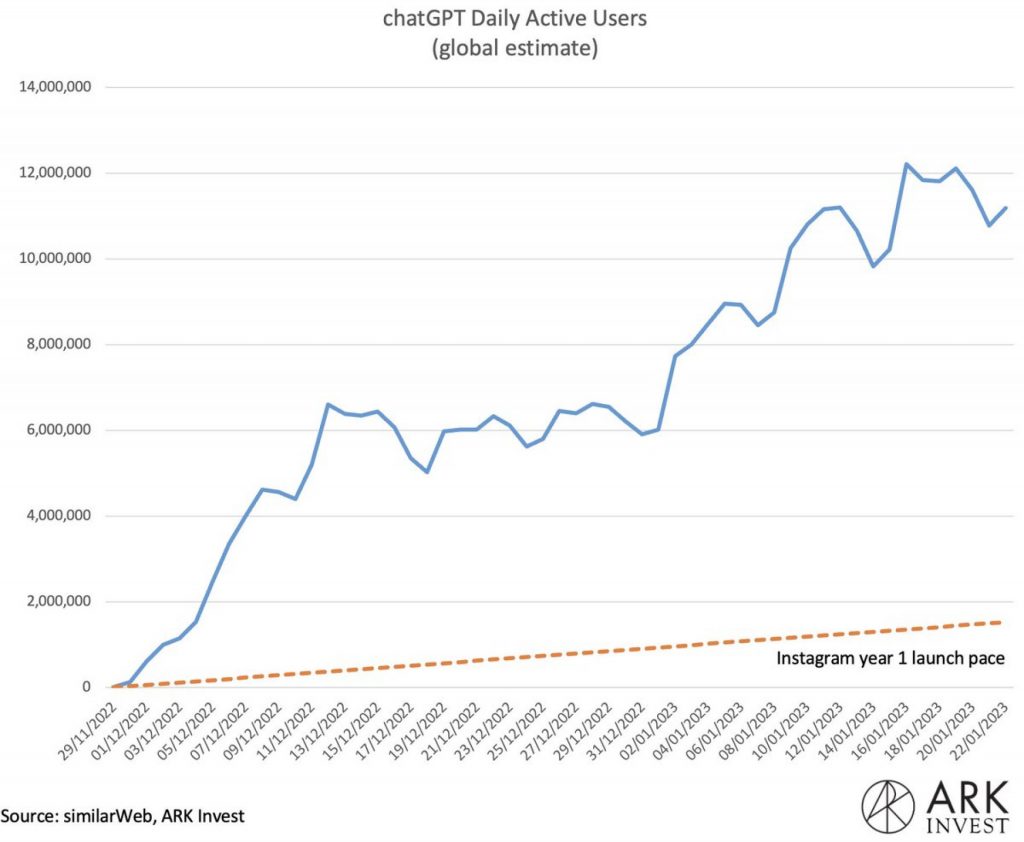 现在取得了更惊人的是它每天超过1000万用户在40天,超过流行Instagram最初的快速增长。是的,这几乎是疯狂的认为人们使用ChatGPT超过人们使用最常用的社交媒体平台。