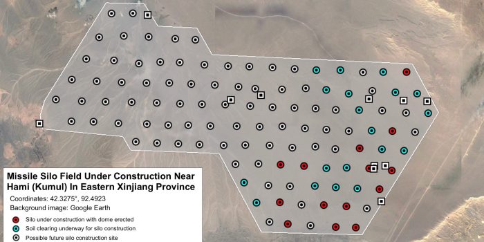 一个月前拍摄的卫星的最新图像表明,中国建造了119枚导弹筒仓,完全一样。它们位于Yumen City附近的沙漠中,该城市位于该国西北部。