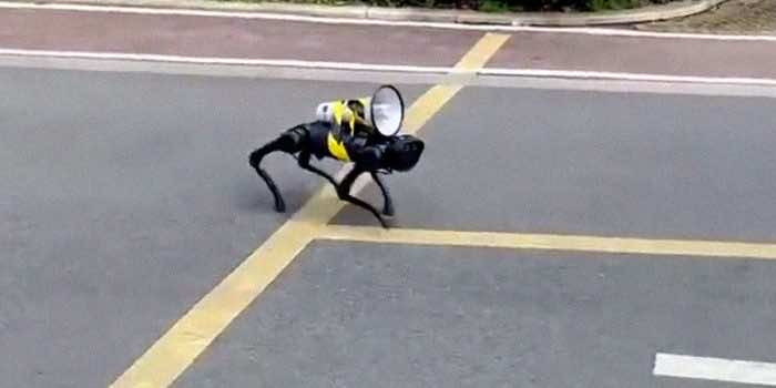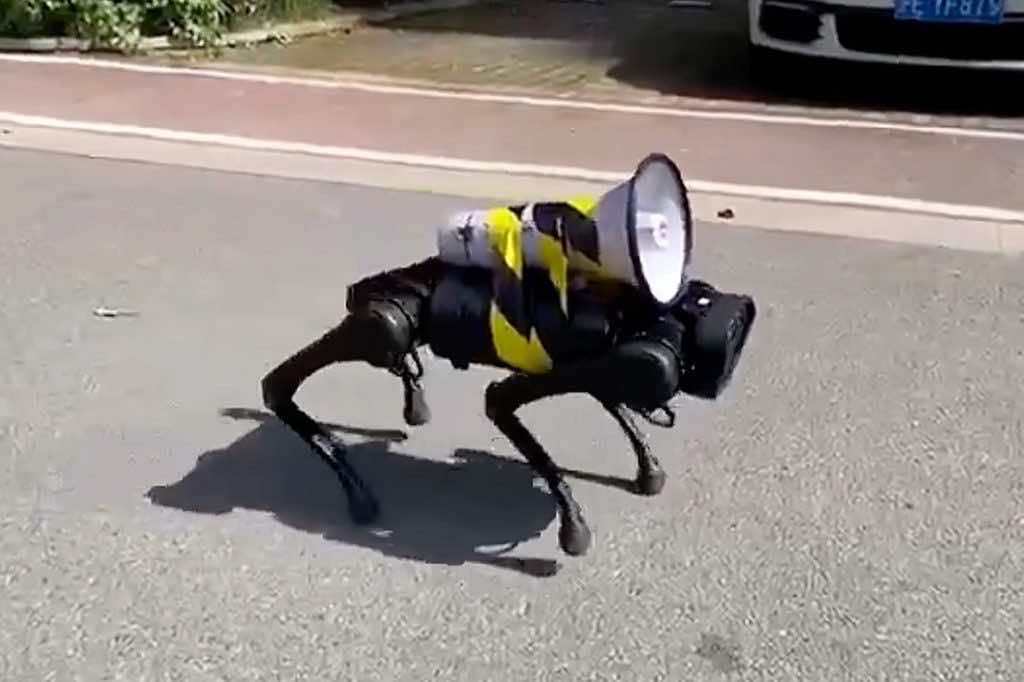 这只黑色的小型四足动物在空荡荡的城市街道上奔跑,通过一个松松垮垮地绑在它背上的扩音器大声发出指令,扩音器上似乎绑着黑黄相间的警戒线。