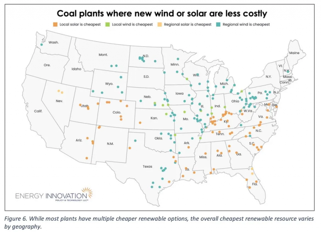 根据能源创新,除了一个燃煤发电厂的运营成本高于替换为新的风能和太阳能。然而,根据智库的分析,除了五可以更具成本效益的可再生能源取代28英里半径内的选项。