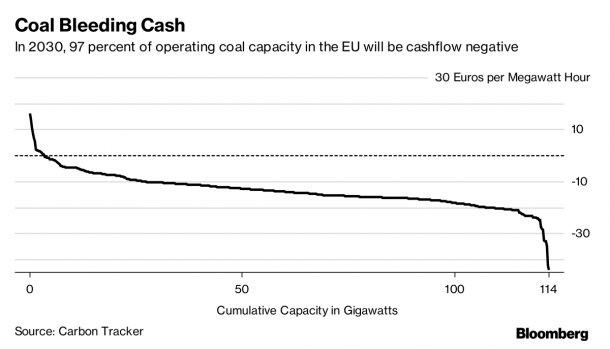本月早些时候发布的一份报告是英国智库碳追踪计划,这表明,54%的煤电厂在欧洲正遭受损失和数量预计将增长到2030年的97%。