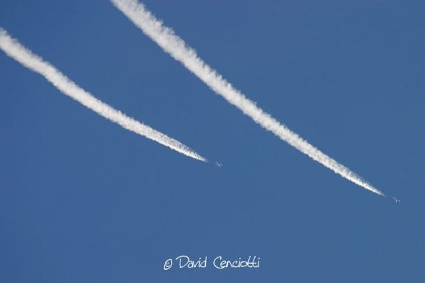 烟雾不是这些白色痕迹的主要成分。事实上,这些轨迹是“凝结轨迹”,简称为“尾迹”。飞机发动机燃烧时会产生废气。尾气中含有二氧化碳、氮氧化物、碳氢化合物、煤烟和大量水蒸气等气体。飞机在3万英尺以上的高空飞行,那里的温度会非常低。