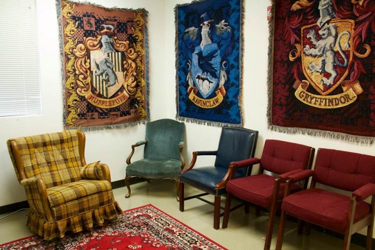 The walls of the classroom are decorated with banners of all four Hogwarts houses, stone-brick wallpaper for the castle-like look, leather-bound books, quill pens, the complete set of Quidditch balls, a part of Ollivander’s Wand Shop, and a silver Pensive. Of course, no Harry Potter themed place goes anywhere without the “Platform 9¾” element. The platform sign at the entrance is adorned with a poster, quoting Dumbledore’s beginning of the year speech.