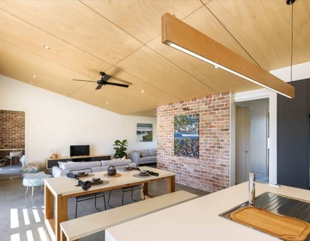 住宅内部有大的落地窗,抛光的混凝土地板和内置的木质家具。它使用了再生砖,住宅也有一系列裸露的砖墙,与住宅的木质面板天花板和白色饰面形成对比。该公司表示,“我们坚信,无论预算如何,每个想要建造自己家园的人都应该拥有良好的设计原则。为此,我们创造了一个建筑规模,允许建筑适应6星到10星之间的任何星级。”