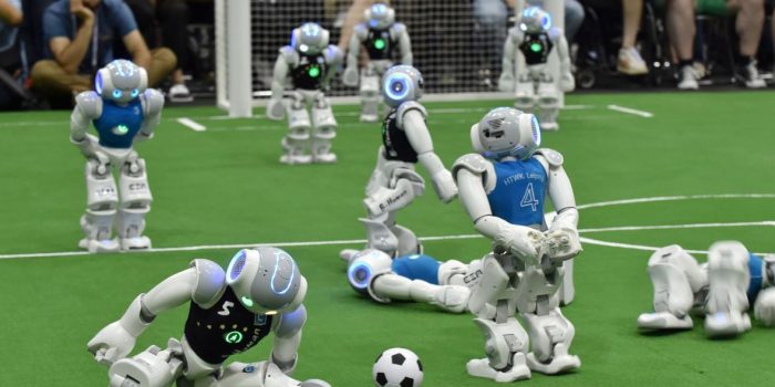 在Robocup下的团队已经拥有具有先进的人工智能系统的人形机器人,使他们能够自行决策,并通过传球或投篮来像普通球员一样踢足球。但是不要让这种描述吓到您,因为与实际人类相比,它们的大小很小(而且很可爱)。