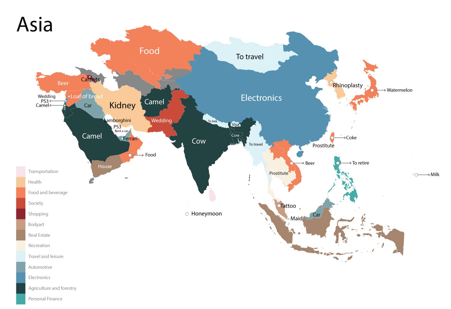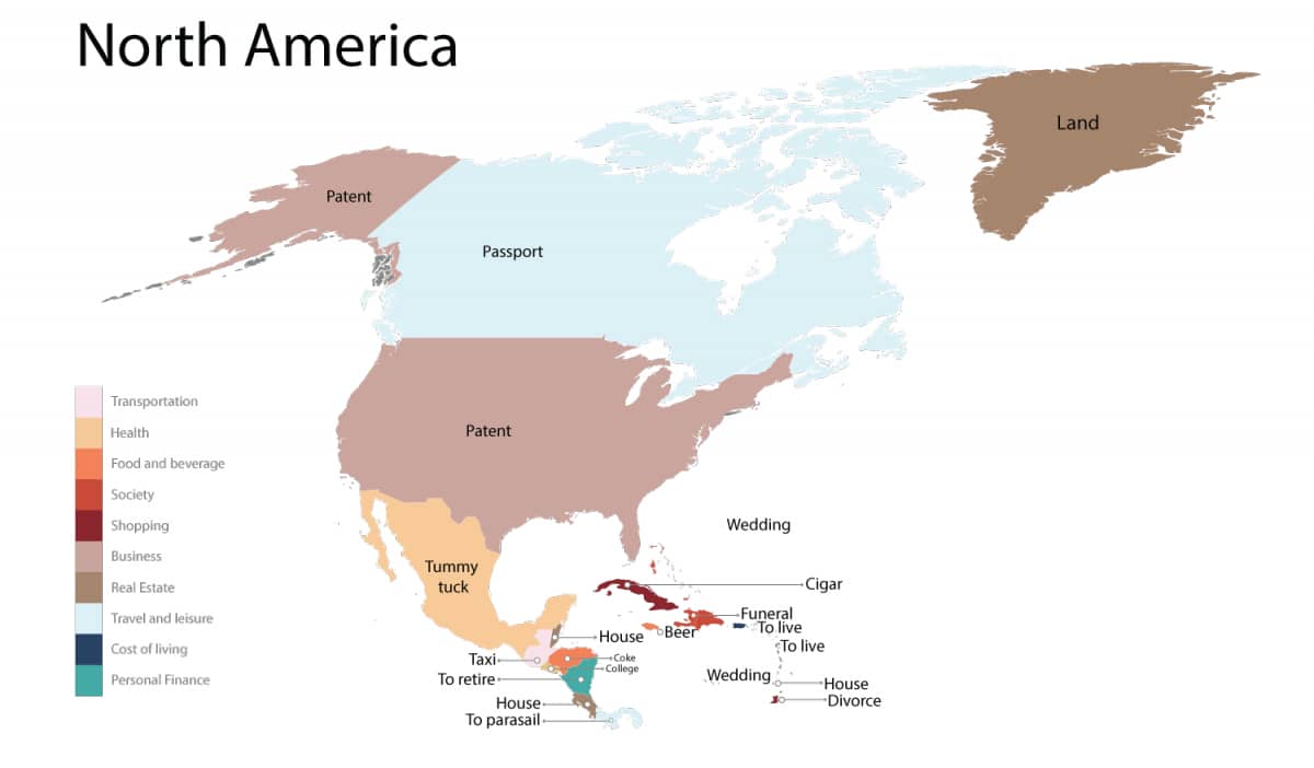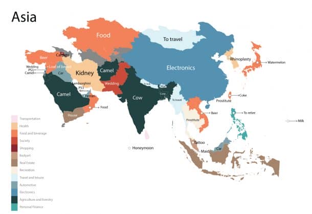 该网站汇总了世界地图,显示了每个国家 /地区最多的产品。他们为Google搜索使用了一个简单的公式:“ [X Country]的价格是多少。”我们都知道Google搜索结果如何随您的偏好,搜索时间,搜索地点和您自己的搜索历史记录而变化。尽管如此,它确实使您对国际对国家的看法有了一个很好的了解。