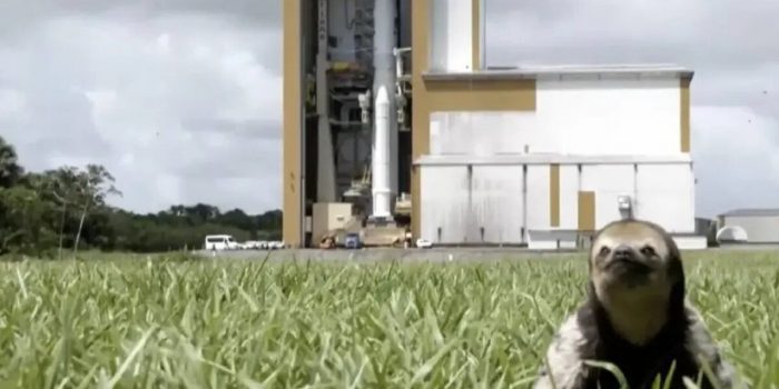 为了捕捉这一历史性的发射,摄像机放大了现场,结果却惊讶地发现前景中有一只可爱而又可爱的小树懒。
