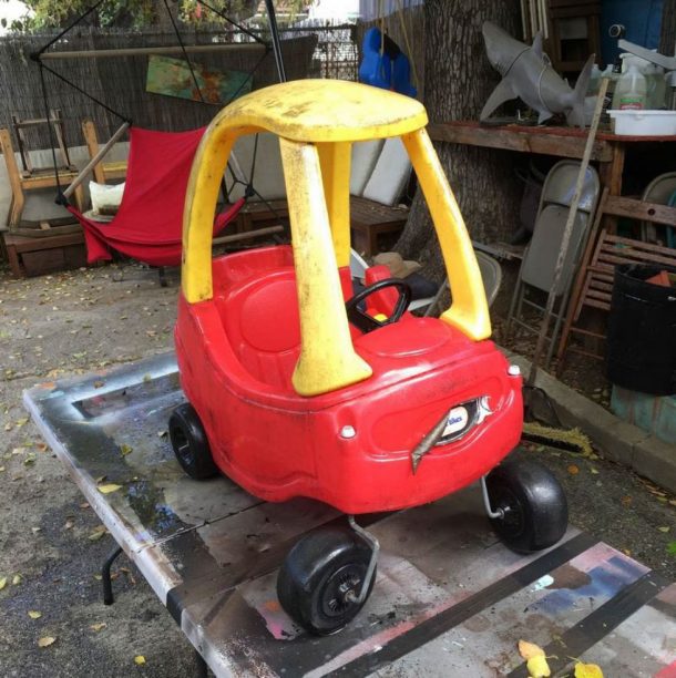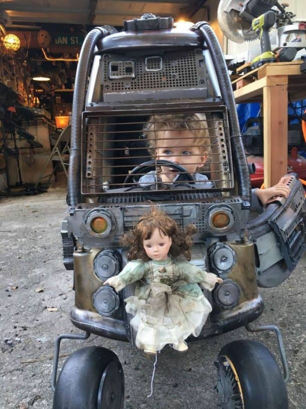 伊恩·普法夫(Ian Pfaff)始于设计经典的小泰克(Tykes)舒适的双门轿跑车,他使用旧计算机垃圾,一台浓缩咖啡机,基本上可以找到在自己的车库里丢弃的任何东西。但是与选民不同,结果令人惊讶,因为他的孩子们被看到骑了两辆疯狂的麦克斯:狂暴的公路车辆,看起来像真正的交易!