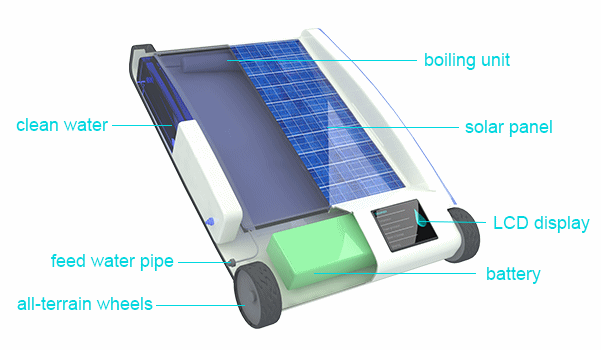 据开发人员介绍,与目前类似规模的活性系统相比,荒凉器可以提供每升纯净水的最低成本。这是一种平板电视大小的设备,顶部由倾斜的表面组成,上面装有光伏电池板。它的建造寿命总共为20年,同时运动车轮适合在所有地形上工作。
