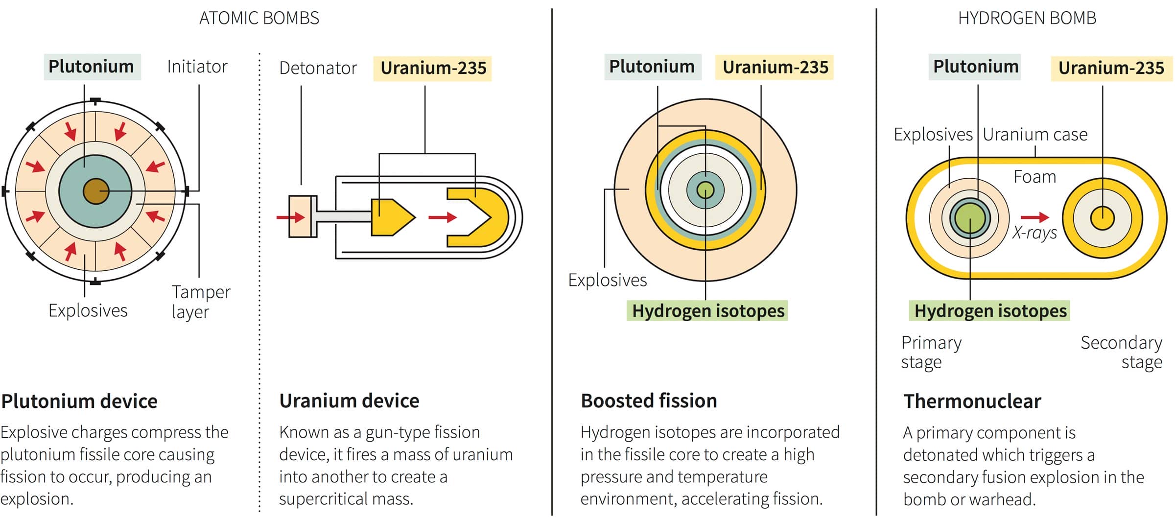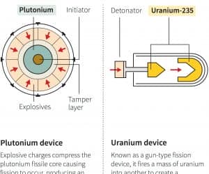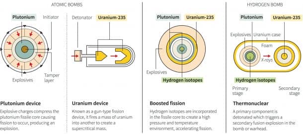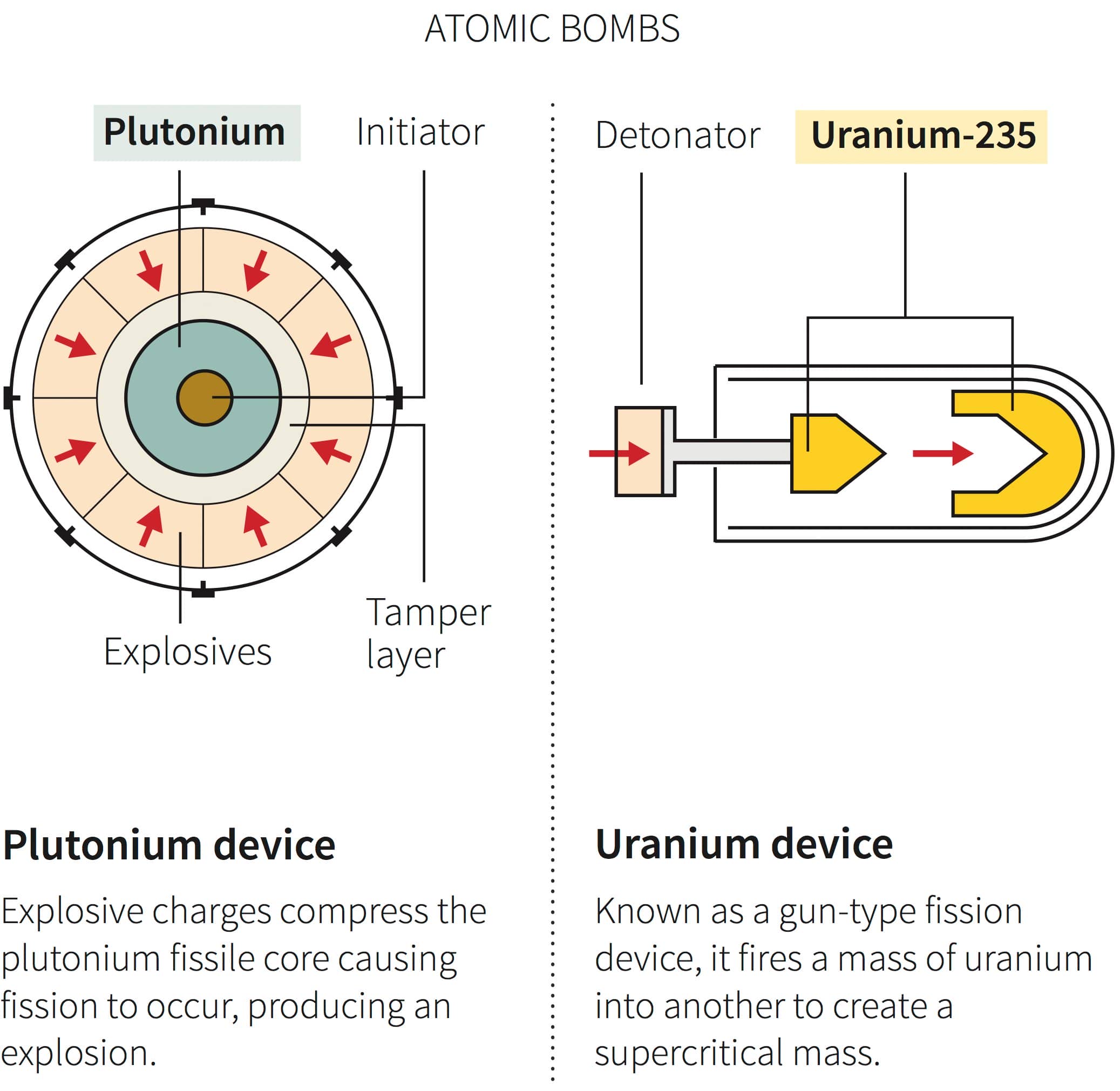 有两种类型的这样一个炸弹,一个是枪类型,丰富的核材料的爆炸球到另一个这样的力量,它会导致核连锁反应。其他Implosion-type实现核裂变的准确性和效率,崩溃空心球体在核材料的核心。路透的图像显示了一个例子。有趣的是胖子原子弹在长崎内爆型,而小男孩,广岛是枪式引爆。