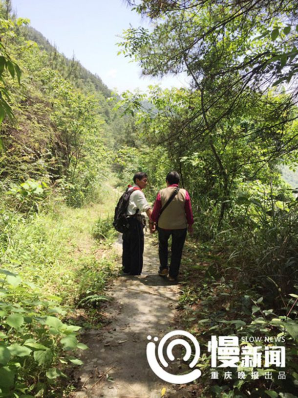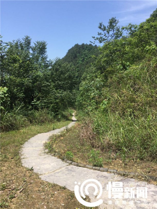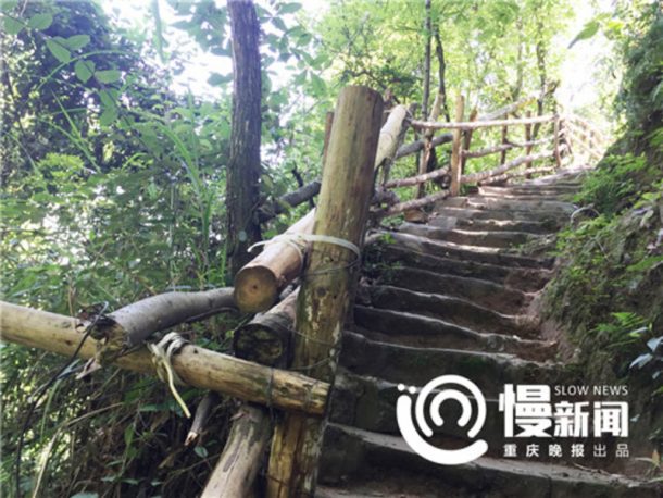 张在中国重庆市附近的富灵森林公园的一座山上铺设建筑材料,以使从现代道路到顶部的一个孤立村庄的数百米的安全步行道,从村庄到它的村庄水源。