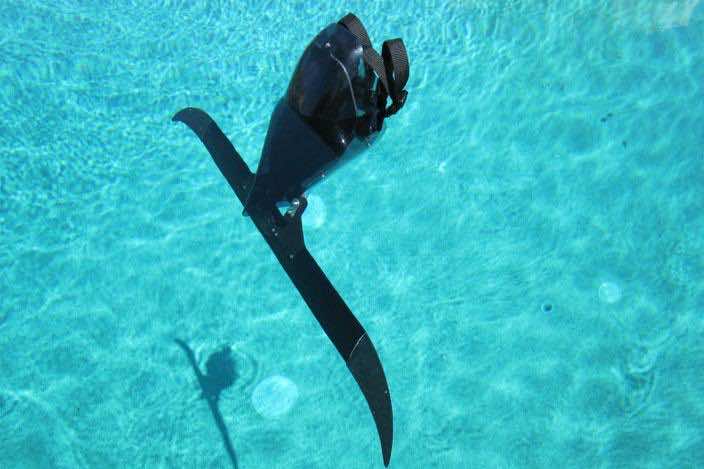 鱼鳍通过使用尼龙/弹性体复合悬挂框架连接到脚上,这使得鱼鳍能够自由地向上或向下倾斜,类似于海豚改变其吸肢的俯仰。鳍是由铝制成的,这是刚性的,而一些型号也支持后掠柔性橡胶尖端。