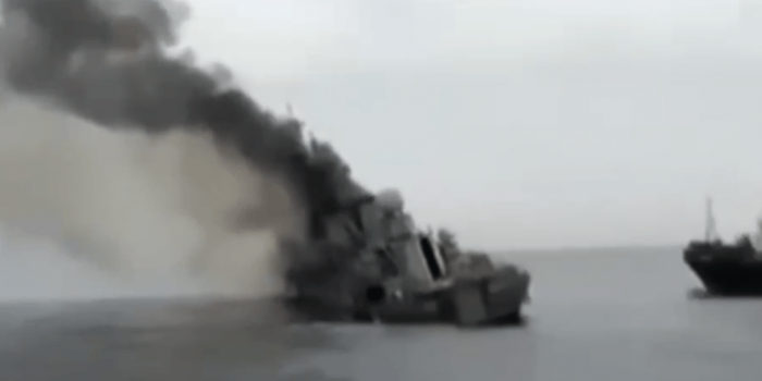 它似乎与Moskva相同,在残废的船只周围有几艘救生艇,被黑烟吞没。