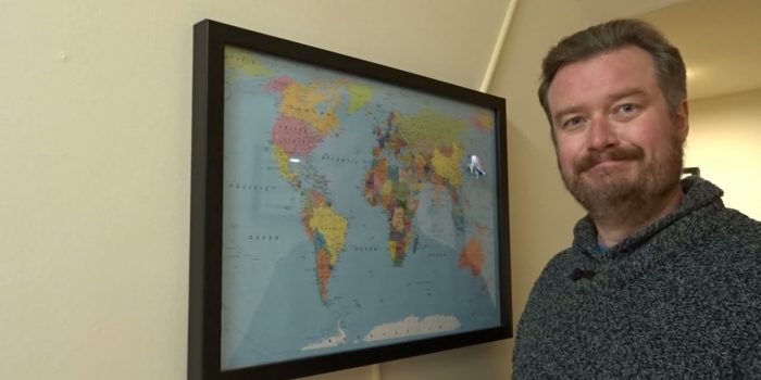 所以,虽然莎士比亚不是第一个把巨大的平板显示器变成假窗口的硬件黑客,但他确实想出了一个新方法来改变窗口提供的视角。附近的墙上挂着一幅全球地图,LED灯显示了阿姆斯特丹和拉斯维加斯等五个不同城市的地图。不用拿遥控器或笔记本电脑,只需在地图上的这五个城市中的任何一个上重新定位一架小型磁性飞机,窗口中的视图就会刷新,这要归功于全天实时拍摄每个城市的摄像头。