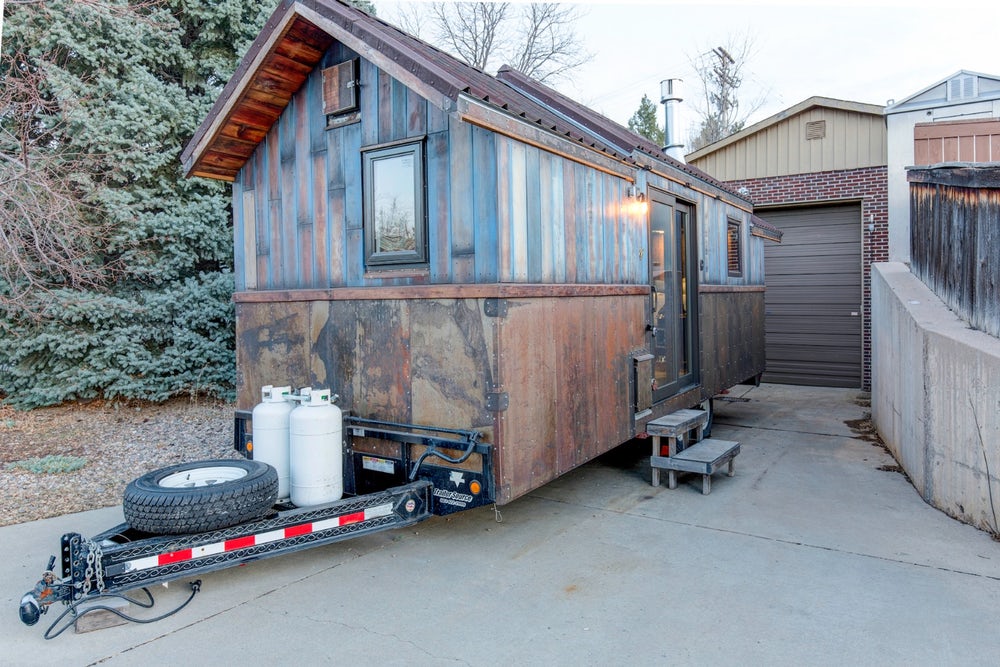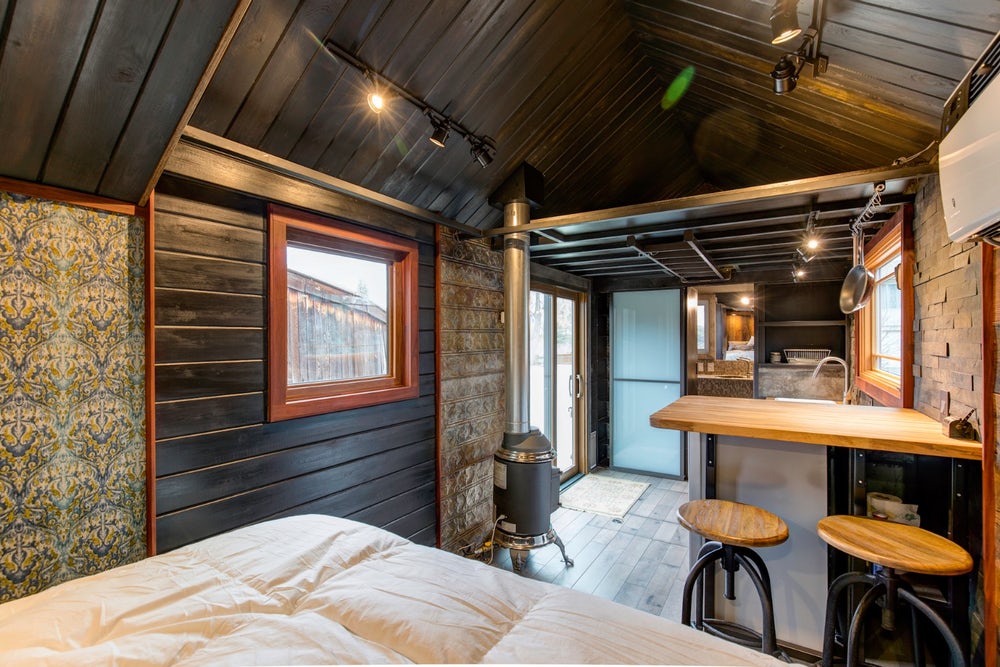 房子的底部是一辆24英尺长的拖车,整个房子占地超过200平方英尺,采用了钢框架。心形松木、蓝色着色雪松和钢装饰覆盖了整个住宅,还包括一个小型宠物门。Onduvilla瓷砖铺在房子的屋顶上,屋顶配有应用程序控制的空调装置。