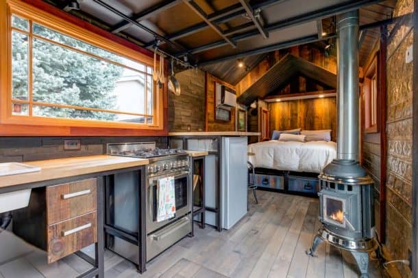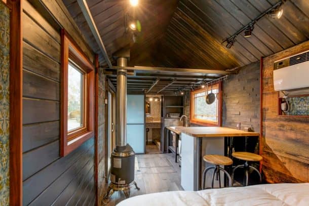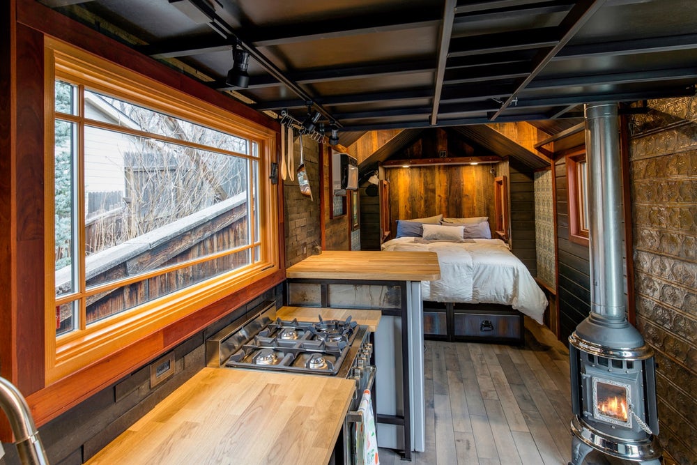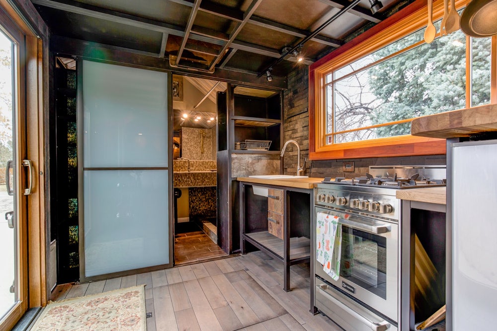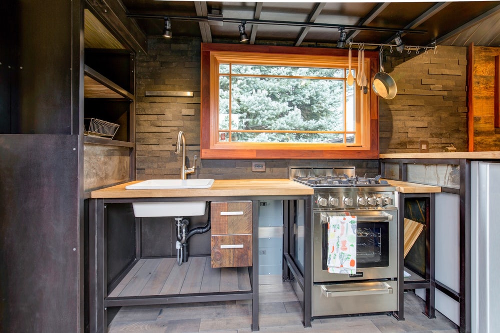 房子的入口是一扇可以滑动开的大玻璃门。一个时髦的维罗纳烤箱和一个丙烷炉在小厨房里闪闪发光,还有一个节能冰箱,甚至可以同时使用电网和太阳能。瓷水槽、定制橱柜和砧板台面为狭小的空间增添了更多的档次。厨房旁边是一个带两把可调节凳子的小用餐区。