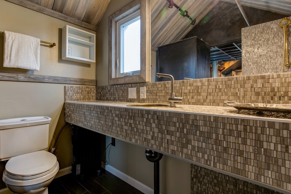 卧室位于一楼,没有单独的客厅空间,但卧室可以转换为休息区。卧室上方的小储物阁楼可以通过梯子进入。滑动隔板将豪华浴室与其他有黄铜水槽、厕所和步入式淋浴间的浴室分隔开来。光是淋浴喷头就要1000美元。墙壁的内部覆盖着鳄鱼皮墙纸,有一部分完全覆盖着19世纪内布拉斯加州监狱的古董压锡。