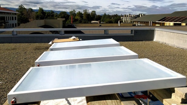 一组来自斯坦福大学多年来一直试图想出一个成本有效的解决方案,可以安装在屋顶上保持建筑物的凉爽只需多余的热量散发到空气中。唯一的问题是,热量从热的东西流向冷的东西,和外面的温度明显比内部。太阳panel-like设备由斯坦福团队可以冷水不使用任何外部能源的来源。