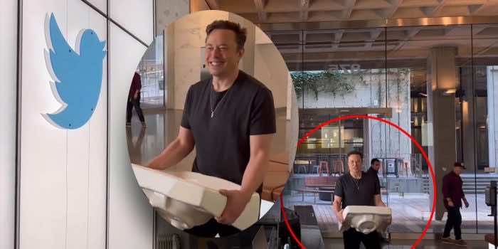 Elon Musk访问Twitter总部的一个周末的最后期限之前关闭他的收购公司,发布一个视频自己携带一个水槽在旧金山公司的游说。