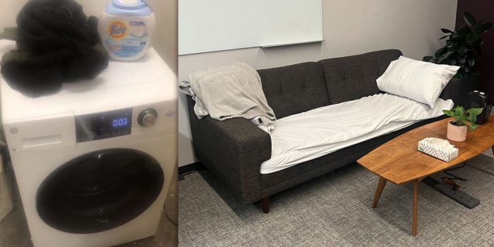一张照片显示了一个有衣柜的房间,另一张照片显示了几张沙发被改造成单人床。一张图片显示,床垫上有拖鞋。克莱顿还分享了一段关于一台洗衣机的视频,这台洗衣机是为员工安装的,可以用来洗衣服。