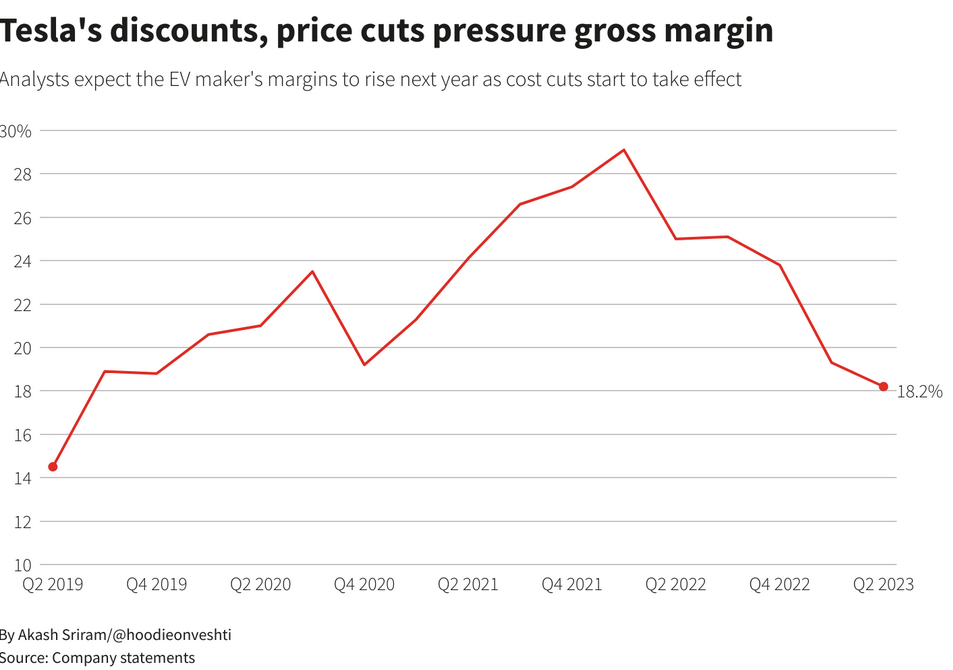 由于削减价格和其他因素,特斯拉的季度汽车第二季度毛利率降至18.1%,低于第一季度的19%,远低于上年同期的26%。4 - 6月期间的总体毛利率为18.2%,最低的在16个季度。
