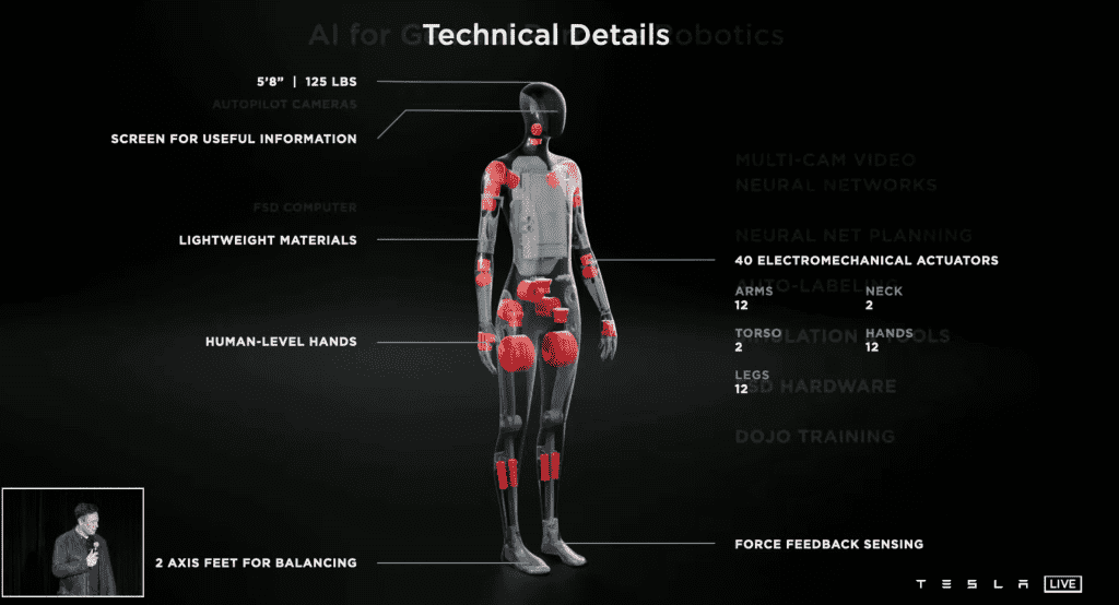 根据2021年AI事件期间的一场演示,擎天柱将大约173厘米(5ft’8)高约57公斤,其承载能力为20磅。特斯拉为电动汽车开发的相同人工智能技术将控制它。