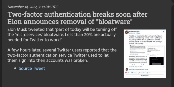 推特(Twitter)用户报告称,在该社交媒体平台上难以访问双因素认证,这引发了人们对个人和企业用户在注销时可能无法访问其账户的担忧。一些Twitter用户表示,他们在Twitter的双因素认证系统上遇到了问题;在埃隆·马斯克对该平台做出巨大改变之际,他们的账户周一被暂时锁定。