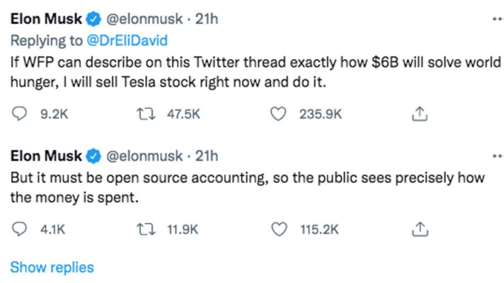 这一说法遭到了马斯克本人的质疑,他回应了比斯利的评论,比斯利称60亿美元就可以让4200万人免于死亡。马斯克在推特上写道:“如果世界粮食计划署能够使用透明和公开的会计方法,在这个推特帖子上准确描述60亿美元将如何解决世界饥饿问题,我将立即出售特斯拉的股票,并采取行动。”